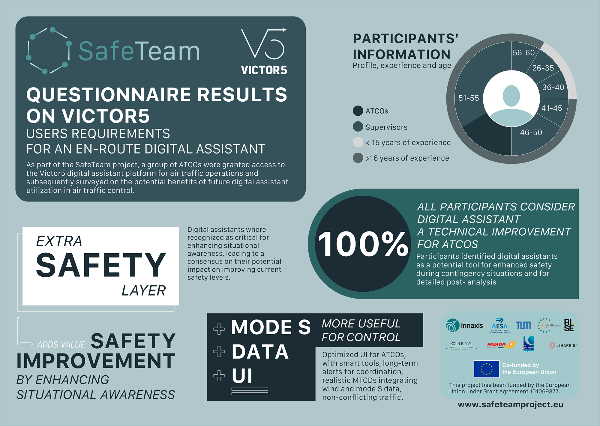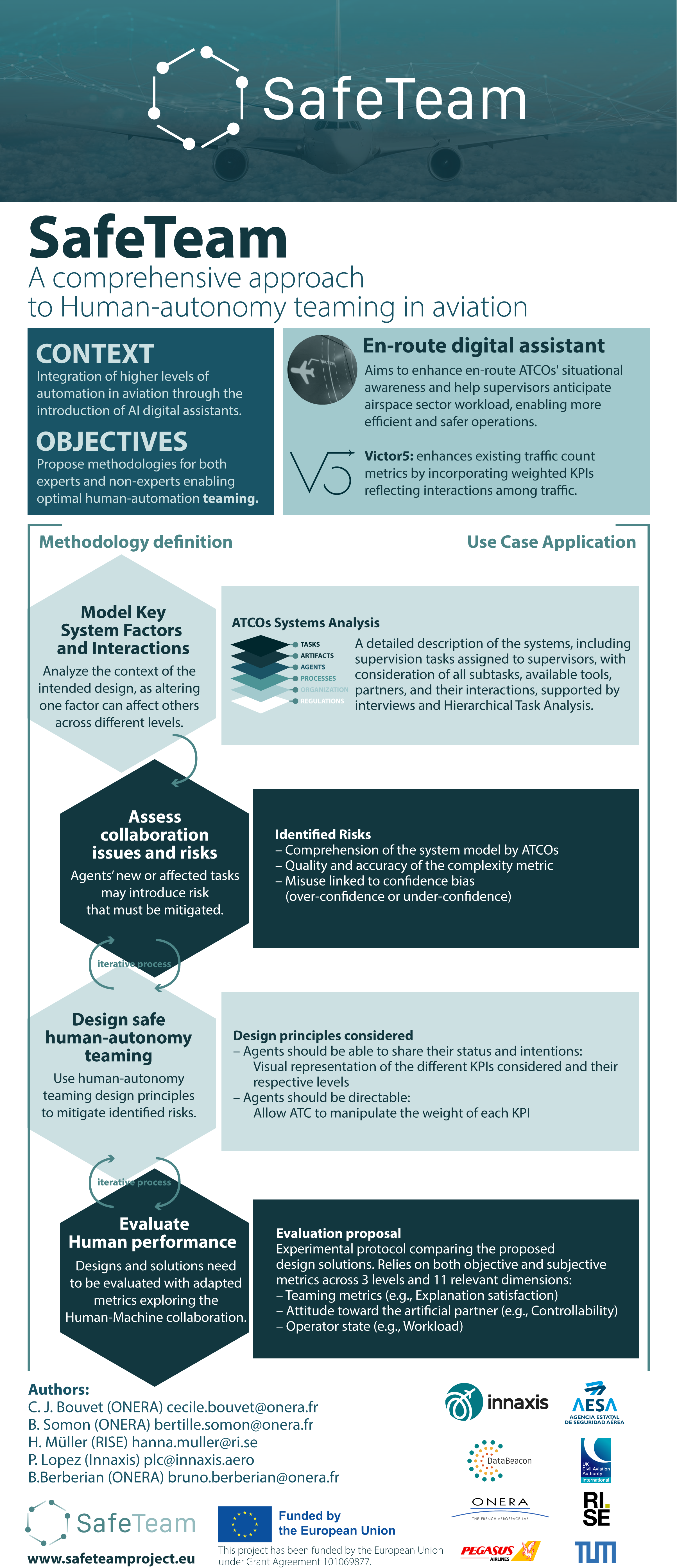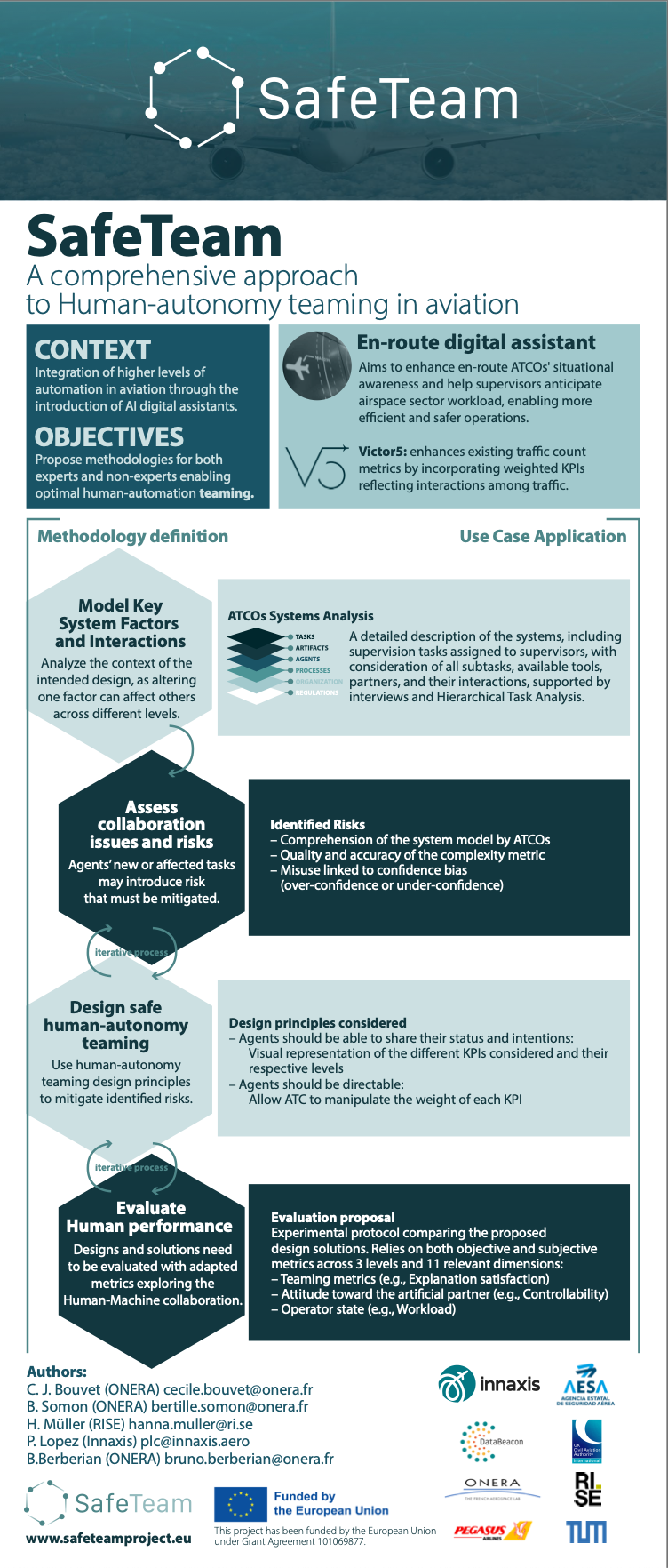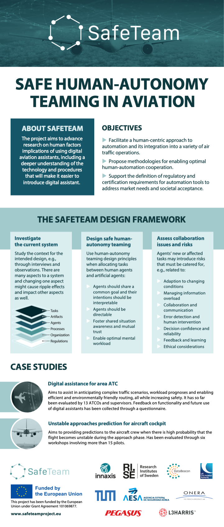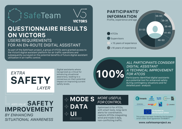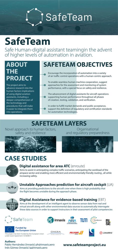 SafeTeam progresses on the human factors aspects on the use of digital assistants to aviation, including a deeper understanding on the technology and processes that will facilitate the adoption of AI tools and integration into operations, enhancing human cognitive abilities and potentially automation. The project will also look into approval and certification issues, concretely on aspects related to the human ability to operate sophisticated AI tools and explainability of AI operations.